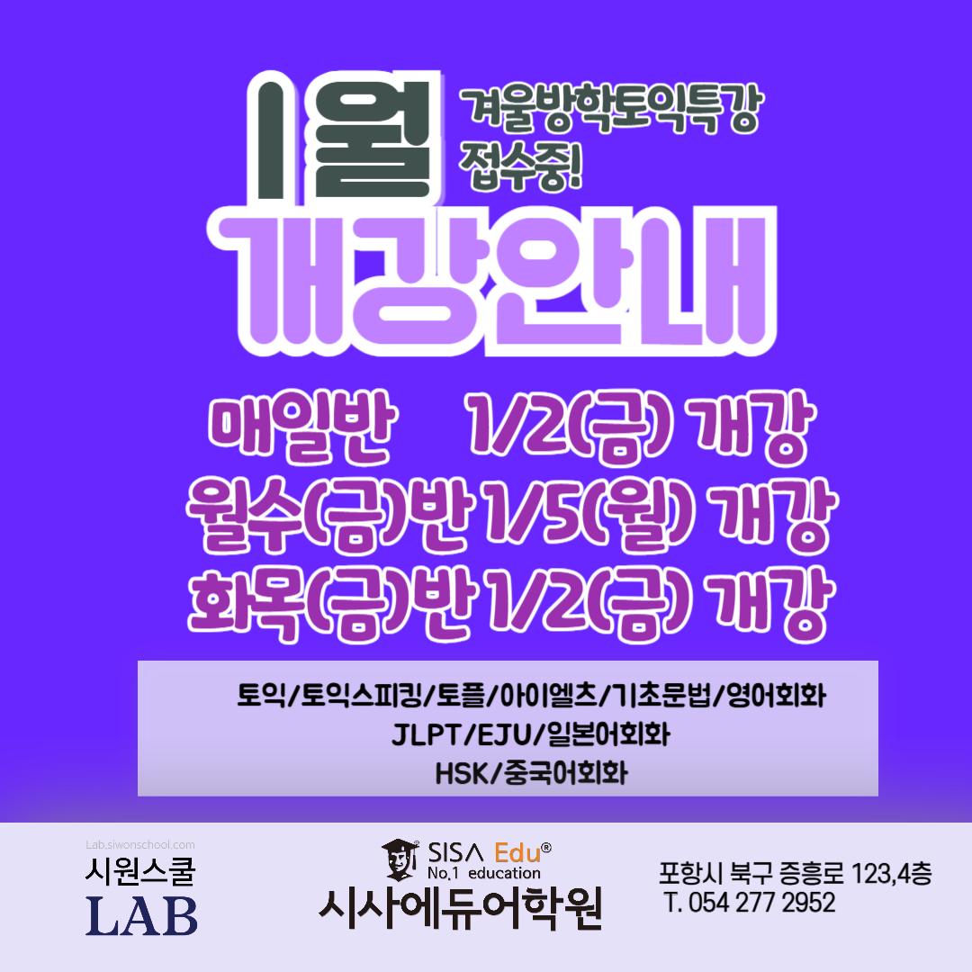 시사에듀어학원 모든 수업 1월 개강 안내드립니다 매일수업 1월2일(금요일개강) 월수(금)수업 1월5일(월요일개강) 화목(금)수업 1월2일(금요일개강)